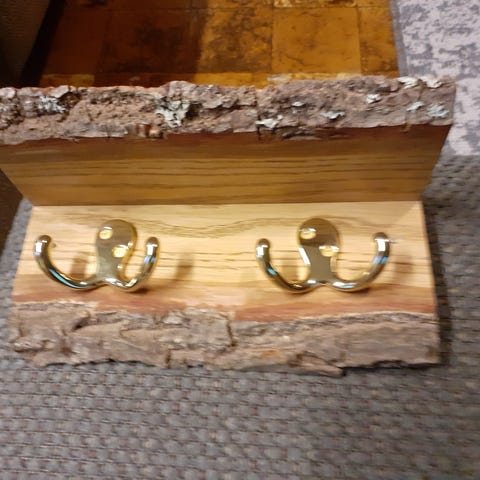 43.5 leveä Aidosta tammesta tehty naulakko neljällä kullanvärisellä ripustuskoukulla.