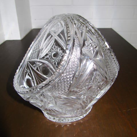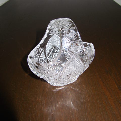 Kristallilasi korikulho, jossa on koristeelliset kaiverrukset ja kädensija. Kirkas lasimateriaali ja koristeellinen muotoilu tekevät siitä sopivan esimerkiksi koriste-esineeksi tai vaikkapa joulumakeisten tarjoiluun.