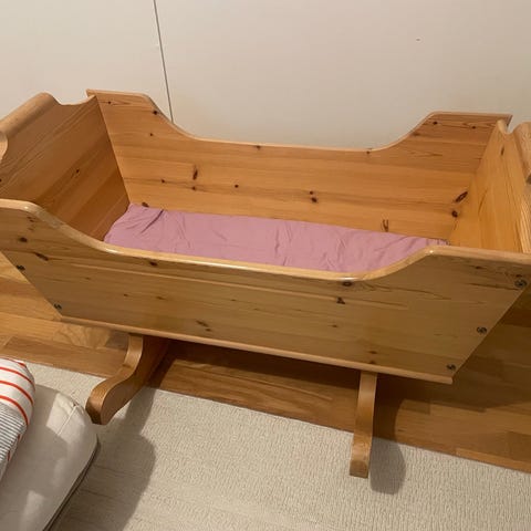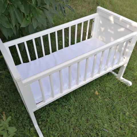 Täyspuinen valkoiseksi maalattu puusepän valmistama kehto. Soveltuu vauvojen ja pienten lasten nukkumiseen.