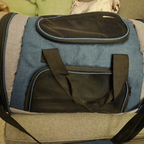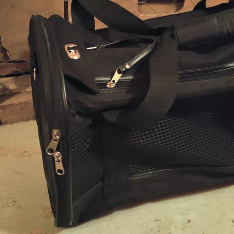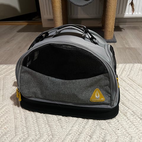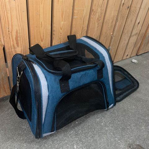 Kätevä ja hyväkuntoinen Basic Traveller kantolaukku kissan tai pienen koiran kuljetukseen. Avautuu sivuilta, ylhäältä ja edestä vetoketjuilla.
