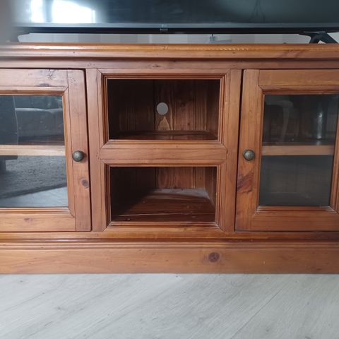 Puinen TV-taso, jossa kaksi lasiovellista kaappia ja kaksi keskellä olevaa laatikkoa. Väri ruskea. Soveltuu televisiovälineiden ja muiden kodin laitteiden säilytykseen.