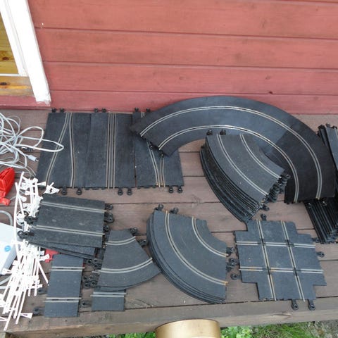 80-luvun meininki, ikää se n. 40 vuotta. Rataa yhteensä n. 18m, kallistettuja kaarteita 8kpl. Noista tekee vaikka minkälaisen radan. Rata ja pistoolit toimivat, mutta parhaiten sopinee lisäradaksi. 6 autoa, joista kaikki autot toimivat, suurin osa moitteitta. Tosin rengaskumit ovat ajan saatossa kovettuneet, eli syytä vaihtaa. Mukaan tulee myös ratakaiteet.