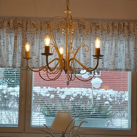 Hieman vajaa 6m pitkä kappaverho. Ollut 3,7m leveässä huoneessa (kuvassa). Kapan korkeus 60cm.