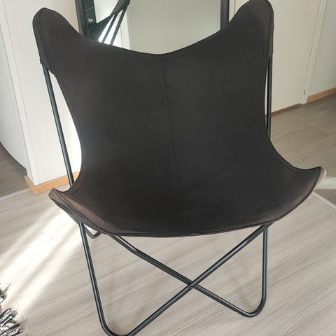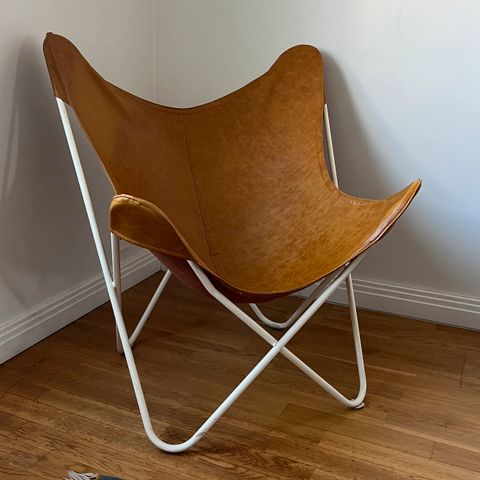 Hyvä kuntoinen Varax merkkinen lepakkotuoli. Päällyste keinonahkaa sävyssä konjakki, ei käytön jälkiä.