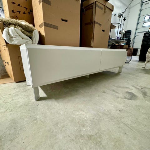 Muuramen Makro Mup TV -(tai muu) taso. Erilliset elementit, voi liittää yhteen tai käyttää erikseen. Mukaan sokkeli 5 cm. (Korkeus sokkelin kanssa n. 33cm). Toinen osa vetolaatikko ja toinen klaffiovella, jonka sisällä ehjä lasihylly. Seinäkiinnityspultit tallella.