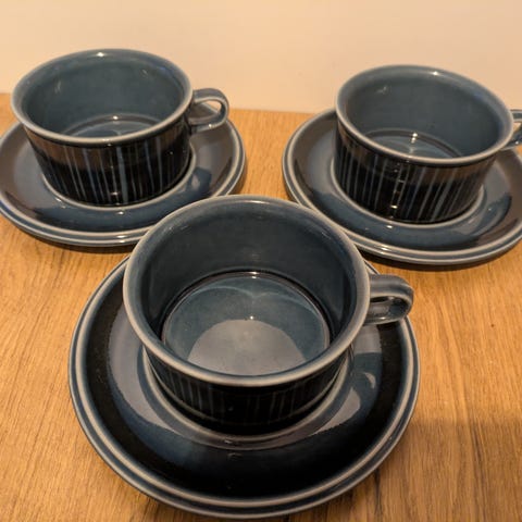 Mukana 6kpl lautasia , 6kpl aluslautasia, 6kpl mukeja , pieni vuoka sekä kermakko