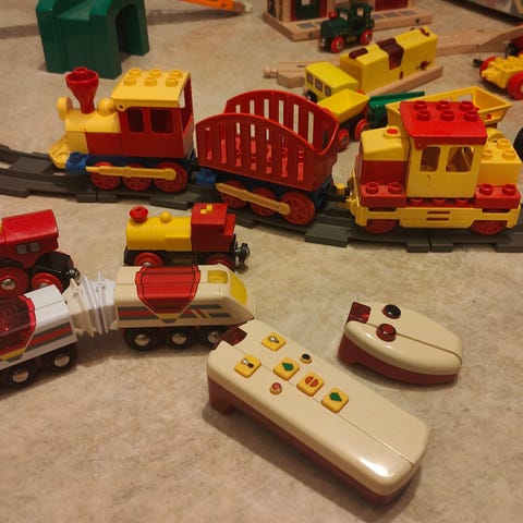 iso Setti. yli 30 junaa, vaunuja ja autoja. erilaisia yksityiskohtia, siltoja, liikennemerkkejä, rakennuksia, ihmisiä ja puita. Voit rakentaa kokonaisen kaupungin. kaksi akkukäyttöistä junaa. Vain nouto.