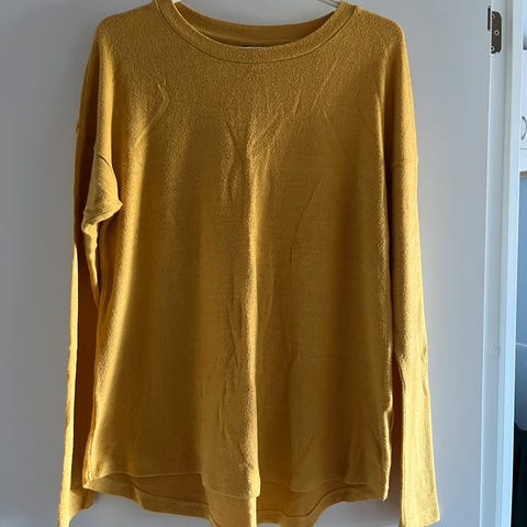 Kevyttä neulosta, 3/4 hihat ja pitkä, reiteen asti ulottuva helma. Mukava päällä. Helmasta nukkaantunut/karstoittunut. Itse käytin tätä raskaana ollessakin, eli on väljää mallia.