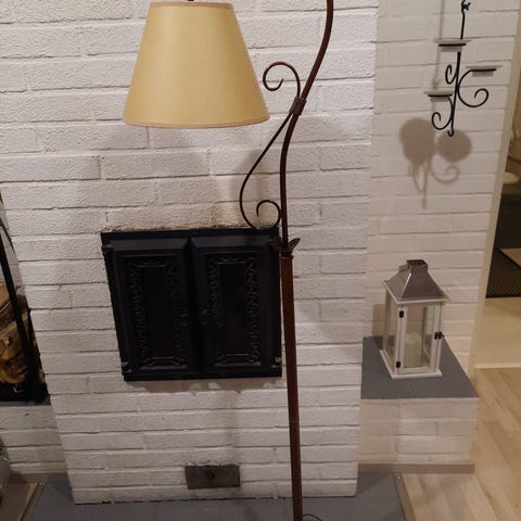 Toimiva puinen jalka ja siisti beige varjostin. Korkeus 142cm. Tavallinen pistotulppa. Voi tarjota.