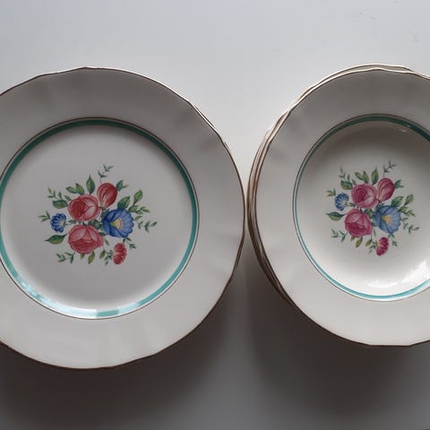 Arabian Pellervo keittolautaset 5 kpl, valkoinen keraaminen materiaali, kukkakuvio koristelussa. Lautaset soveltuvat ruokailuun ja ovat käyttökelpoisia keittiövälineitä. Kahdessa lautasessa näkyy käytön jälkiä ja pieniä kolhuja reunoilla.