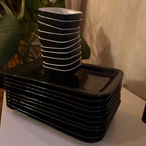 Japanilaiset sushi lautaset,( hyvän laatuset) posliinia.6 kpl. Valkoisia sinisellä koristeella hämähäkki tai kukka miten sen näet. Käyttämättömät. Koko 17 cm*11,5 cm.a’ 5€/kpl.Nouto Ullanlinnasta
