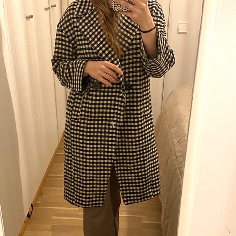 Tyylikäs ja klassinen punainen villakangastakki, jossa napitus edessä ja kaunis istuva leikkaus. Takissa on napakat saumat, vuorillinen sisäosa ja napitettu kaulus. Yksi nappi on irronnut, mutta sisäpuolella on mukana varanappi, joka on helppo ommella paikalleen — ei ole haitannut käytössä. Lämmin ja naisellinen valinta arkeen tai juhlaan.