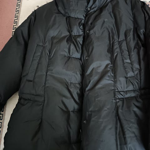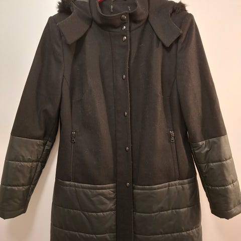 Lämmin talvitakki karvahupulla. Väri tummanharmaa. Toisen taskun sivusta korjattu pieni repeymä, siitä kuva. Menee hyvin 38-40 kokoa käyttävälle.