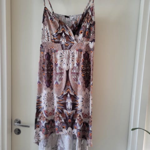 Niskassa napit. Nappisomisteet edessä. Joustaa. 95 % polyesteria, 5 % elastaania. Pituus olka-helma noin 88 cm. Kai-kai joustaa aina yli 60 cm.