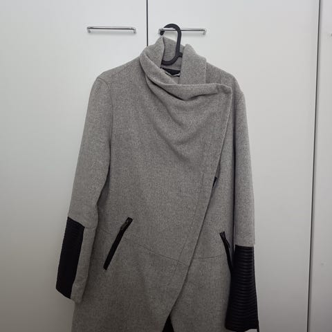 Bershka Pitkä takki harmaassa värissä, naisten XS-koko. Takki on pitkä ja valmistettu materiaalista, joka näkyy kuvissa. Vuoreton.