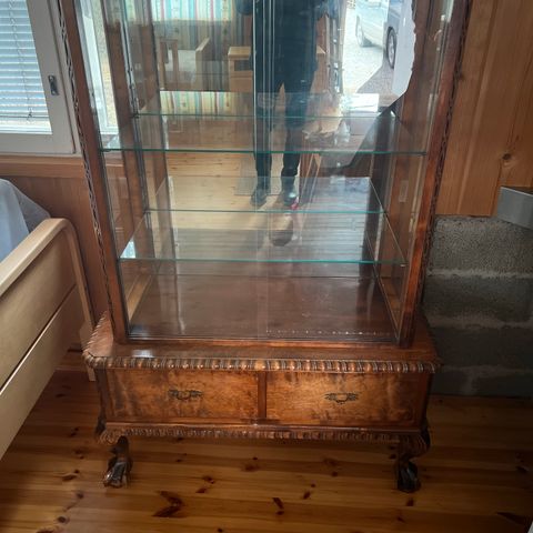 Hyväkuntoinen vitriini kahdella lasihyllyllä ja laatikolla. Vitriinin päällinen pikkusen hilseilee.