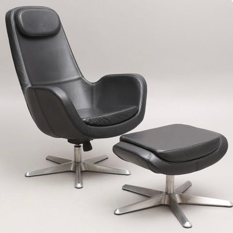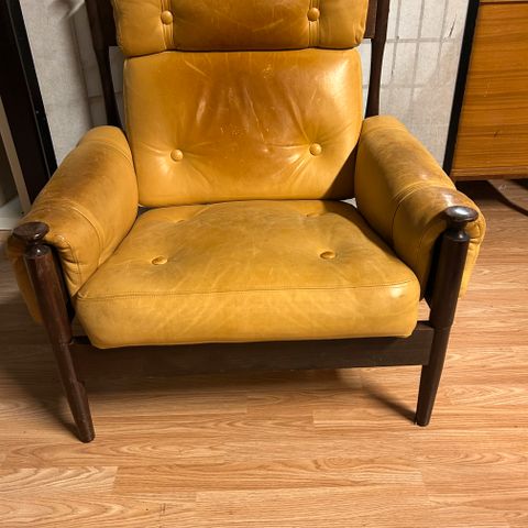 Vähän käytetty nojatuoli myynnissä. Aitoa nahkaa. Merkkiä ei lue, mutta lienee joko IKEA Poäng tai Jysk Tved / Skive (?). Myös Stemma myy vastaavia, hintaa 700-900€.