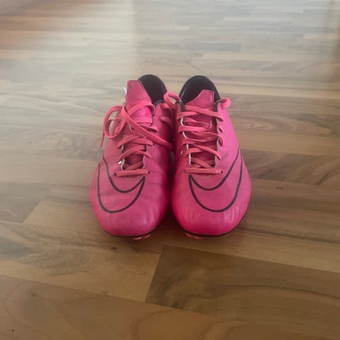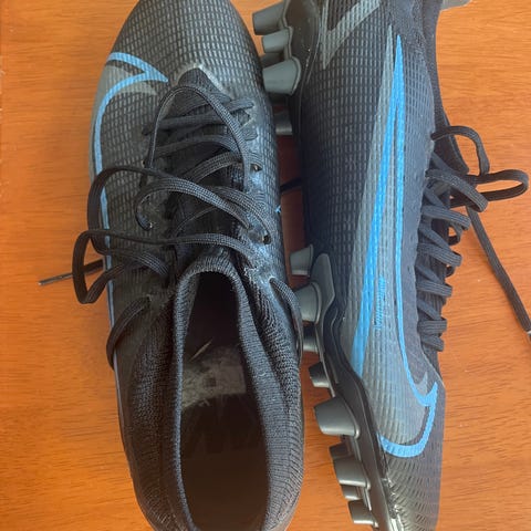 Nike Mercurial jalkapallokengät mustalla ja oranssilla värityksellä. Kengissä on korkeavartinen malli ja ne on suunniteltu tarjoamaan tukea ja mukavuutta jalkapalloon. Materiaali on synteettinen, ja ne sopivat miehille.