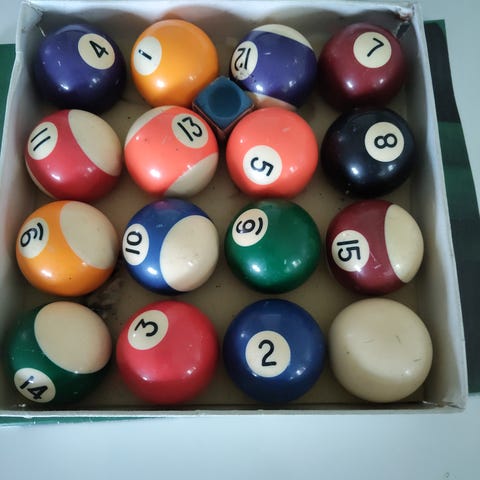 Pöytäbiljardipeli, jossa on musta pelipinta ja siniset yksityiskohdat. Mukana keppi, valkoinen pallo ja värilliset biljardipallot. Toinen keppi hävinnyt, pallot tallella.
