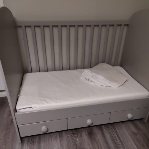 Pakettiin kuuluu pinnasänky, erikseen ostettu valkoinen lisälaita (näkyy kuvassa pohjaritilän alla), patja (ei ole sattunut vahinkoja, patjan päällinen konepestävä), tyyny. Kaupanpäälle saa pinnasuojan.