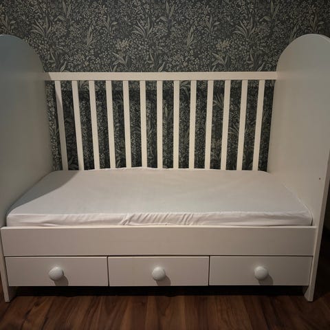 Hyväkuntoinen pinnasänky, jonka etupinnat saa pois ja sänky toimii hyvin taaperosänkynä.