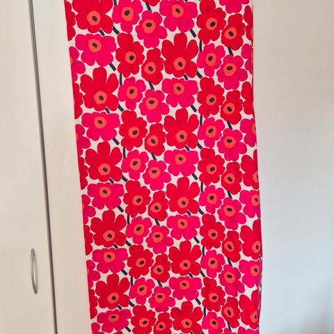 Marimekko Unikko puuvillakangas, jossa kirkkaat pinkit kukat ja vihreät lehdet. Kangas on puuvillamateriaalia ja soveltuu esimerkiksi verhoiluun tai sisustustekstiileihin.
