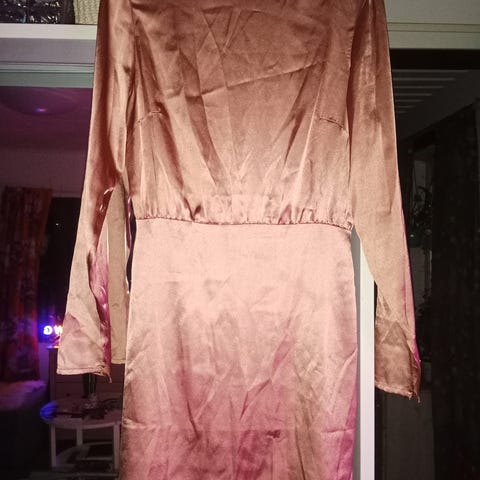 Monenlaiseen tilaisuuteen soveltuva juhlava satiinitunika, harmaa, koko 52, rinnanympärys 130cm. Olka-helma 75cm. Takana solmittava vyö, jolla istuvuutta voi säätää sopivaksi.