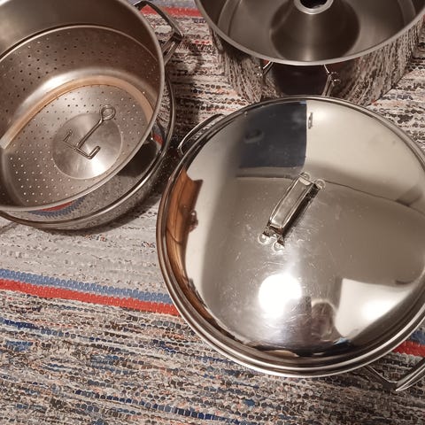 Litroja jo mehustettu, mutta täysin toimintakuntoinen mehumaija vielä. Alimman osan kiehautin etikka-vesiseoksessa, ja tuli aika puhdas. Muiden osien putsaus jää ostajan kontolle.