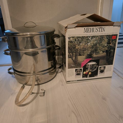 Litroja jo mehustettu, mutta täysin toimintakuntoinen mehumaija vielä. Alimman osan kiehautin etikka-vesiseoksessa, ja tuli aika puhdas. Muiden osien putsaus ostajalle.