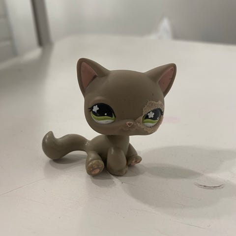 Littlest Pet Shop -merkkinen kissahahmoinen lelufiguuri, jossa on vaaleanharmaa ja valkoinen kissakuviointi ja suuret siniset silmät. Figuuri on pienikokoinen ja soveltuu keräilyyn tai leikkeihin.