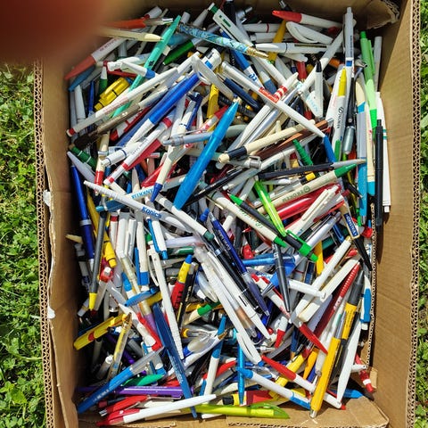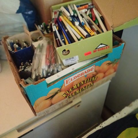 Myydään laatikollinen mainoskyniä, kynien toimivuudesta ei tietoa ja kpl määrästä ei tietoa. Laatikko ei kuulu kauppaan.