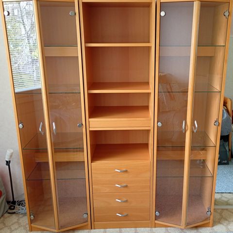 Uudenveroinen pyökin värinen lasiovella varustettu hylly jota voi kutsua myös vitriinikaapiksi. Oven kätisyys on helposti vaihdettavissa kuten kuvista näkyy.