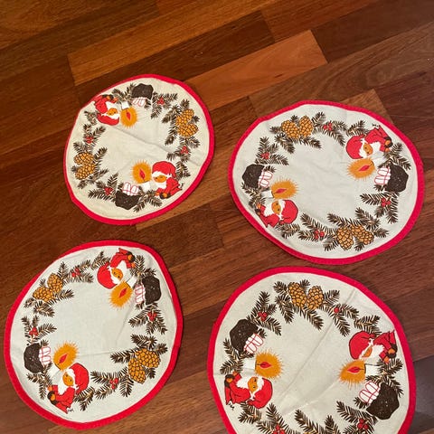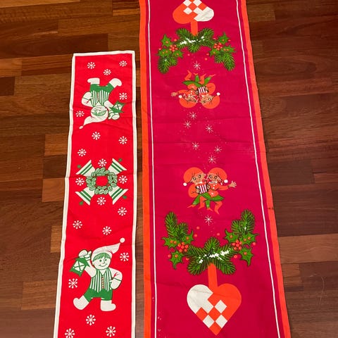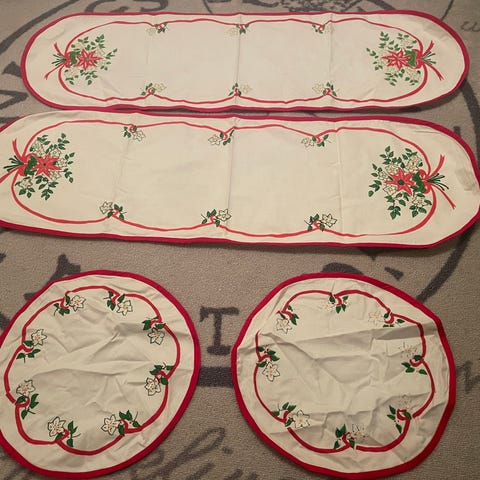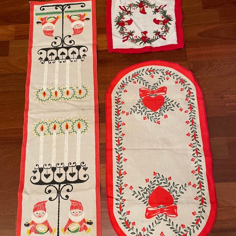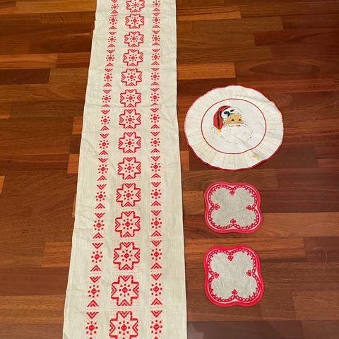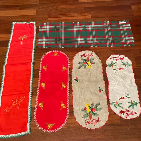 Myydään kuvassa näkyvät Joulu pöytäliinat 5kpl. Yhdessä pienessä liinassa tahraa joka saattaa lähteä pesussa pois näkyy viimeisessä kuvassa Myydään kaikki 5kpl yhteishintaan:15€
