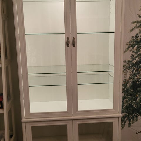 Pähkinän värinen, erittäin siisti ja laadukas puinen kaappi. Huonekalu kaupasta ostettu, ei Ikeasta. Kolme lasihyllyä ja alaosassa yksi pitkä hylly.