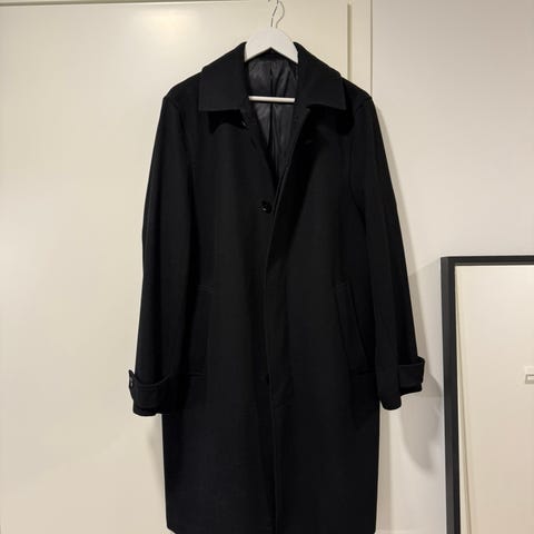 Myydään tyylikäs miesten villakangastakki. Musta, ensimmäisessä kuvassa valotus saa takin näyttämään vaaleammalta, mutta malli näkyy siinä parhaiten.