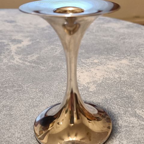 Kultakeskuksesta ostettu Tapio Wirkkalan suunnittelema hopeinen Trumpetti-kynttilänjalka. Korkeus 14,5 cm. Uusi käyttämätön tuote, ei kaiverruksia. Mukana lahjarasia, joka kuvassa.