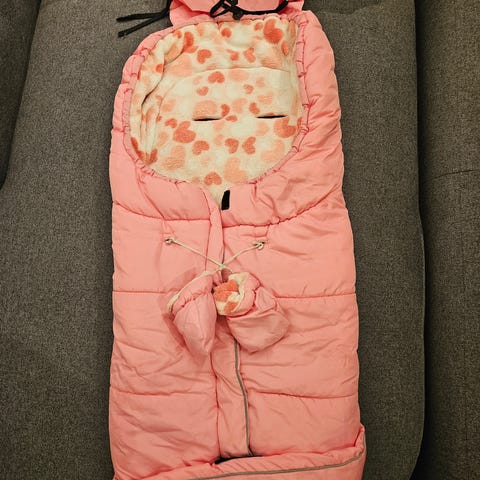 Vauvan makuupussi, jonka voi avata kokonaan ja silloin toimii leikki- tai makuualustanakin. Tai lämmikkeenä kärryissä.. 🙂
