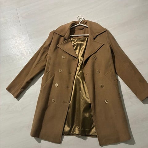 Avainsanat: Pieces villakangastakki ruututakki naisten M vaaleabeige villakangas vyötakki trendikäs vuorillinen syystakki kevättakki