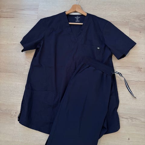 Tummansininen Medanta työpusero. Sopii hyvin hoitoalalle naisille ja miehille Pesu on 70 asteessa. Lyhyet hihat ja edessä taskuja. Kai-kai 57cm.