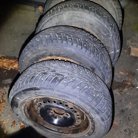 Myydään kuvan, mukaiset nastarenkaat peltivanteilla.