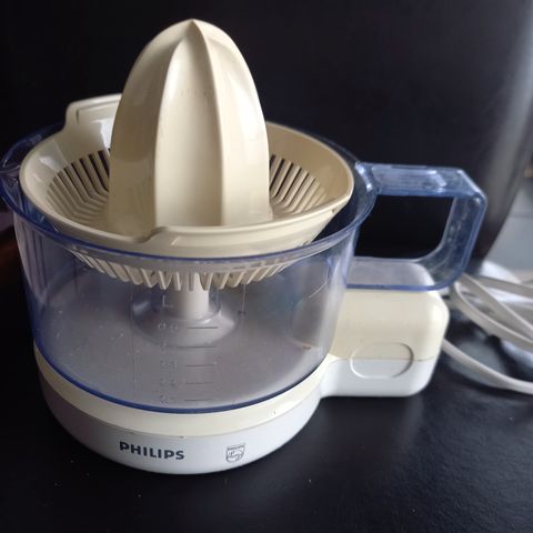 Philips sitruspuristin, valmistettu valkoisesta muovista. Sopii erilaisten sitrushedelmien puristamiseen. Laite toimii sähköllä, mukana johdon pituus. Kompakti ja helppokäyttöinen keittiöväline.