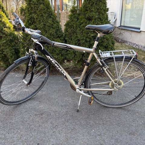 Merida crossfire 8700 hybridipyörä. Pyörässä on 24 vaihdetta, etujousitus, tarakka, runkolukko johon kaksi avainta. Polkupyörä on ollut hyvin satunnaisella käytöllä ja vaikka pyörällä on ikää, se on pysynyt yleisilmeeltään siistinä ja kaikki toimii edelleen kuten pitääkin: vaihteet vaihtuvat sulavasti, jarrut pysäyttävät napakasti ja ilmakin pysyy renkaissa. Säädettävän ohjainkannattimen ansiosta ajoasennon saa muokattua helposti mieluisaksi. Pyörän runkokoko on 55cm.