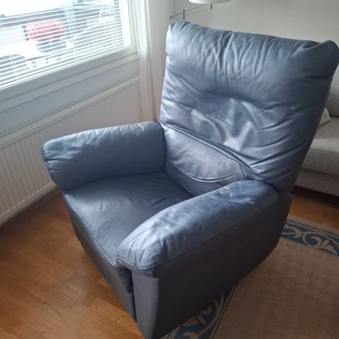 Stressless ekornes nahkatuoli ja rahi. Menee makuu asentoon. Nahka ehjä. Kaipaa nahan hoitoa ja puhdistusta.