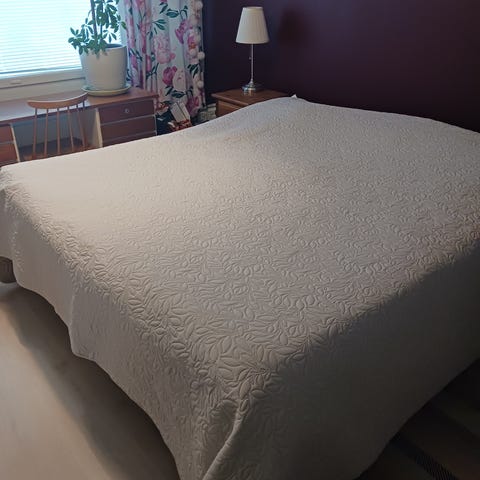 Parisängyn valkoinen päiväpeitto, ohutta materiaalia. Koko 260x230cm. Lemmikitön talous.