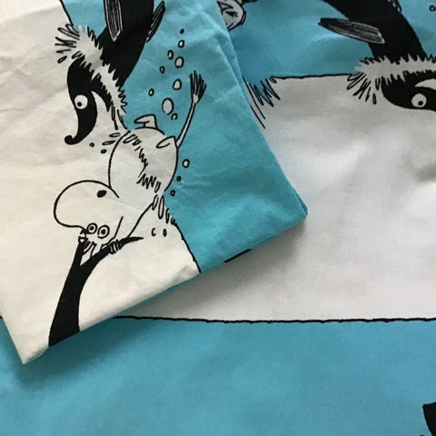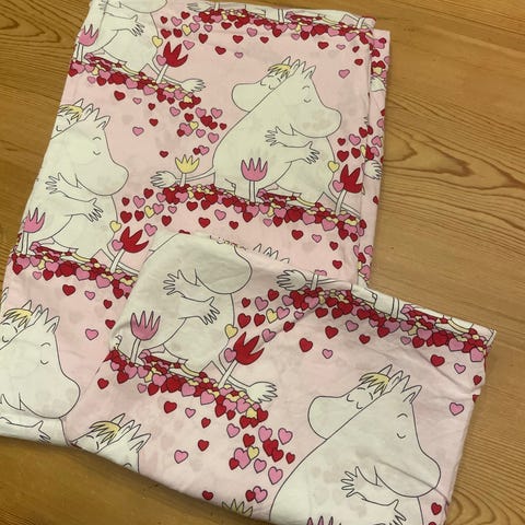 Finlaysonin Muumi-lakanat sekä valkoinen aluslakana pinnasänkyyn. Ehjät, mutta väri haalistunut pesussa. Vain nouto Pohjois-Espoosta tai kulkeutuu omien menojen mukaan. 80 x 120 cm pussilakana, tyynyliina pienempi kuin aikuisten.