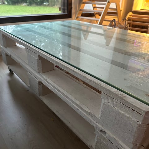 Puusepän valmistama sohvapöytä maitolasikannella. Alla renkaat.