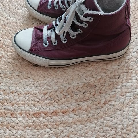 Converse Tennarit koko 35, musta väri, valmistettu kankaasta. Unisex-malli. Korkeavartiset tennarit, joissa valkoiset nauhat ja kumipohja.