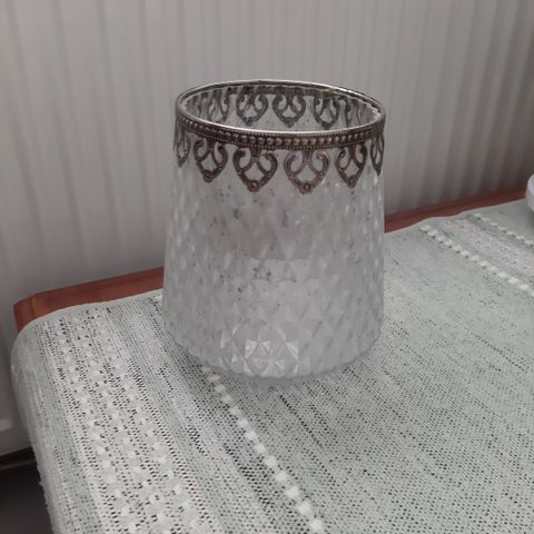Kaunis vihreä / kirkas mosaiikkilasi tuikkulyhty. Pari ensimmäistä kuvaa salaman kanssa otettu. Melko iso, halkaisija noin 12 leveimmästä kohdasta.