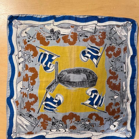 Hyväkuntoinen, asiaan kuuluvasti kellastunut taskuliina. Tehtiin Helsingissä järjestettävien vuoden 1949 olympialaisia varten, jotka sodan vuoksi jouduttiin perumaan. (Vuonna 1952 Suomessa järjestettiin olympialaiset). Liina on harvinainen muisto silloisesta tilanteesta. Pieni reunan purkauma yhdessä kulmassa. Jos kiinnostaa, tarjoa!