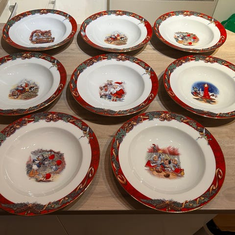 8 kpl isoja lautasia 8 kpl pienempiä ja 2 kynttilänjalkaa. Lähes käyttämättömiä.